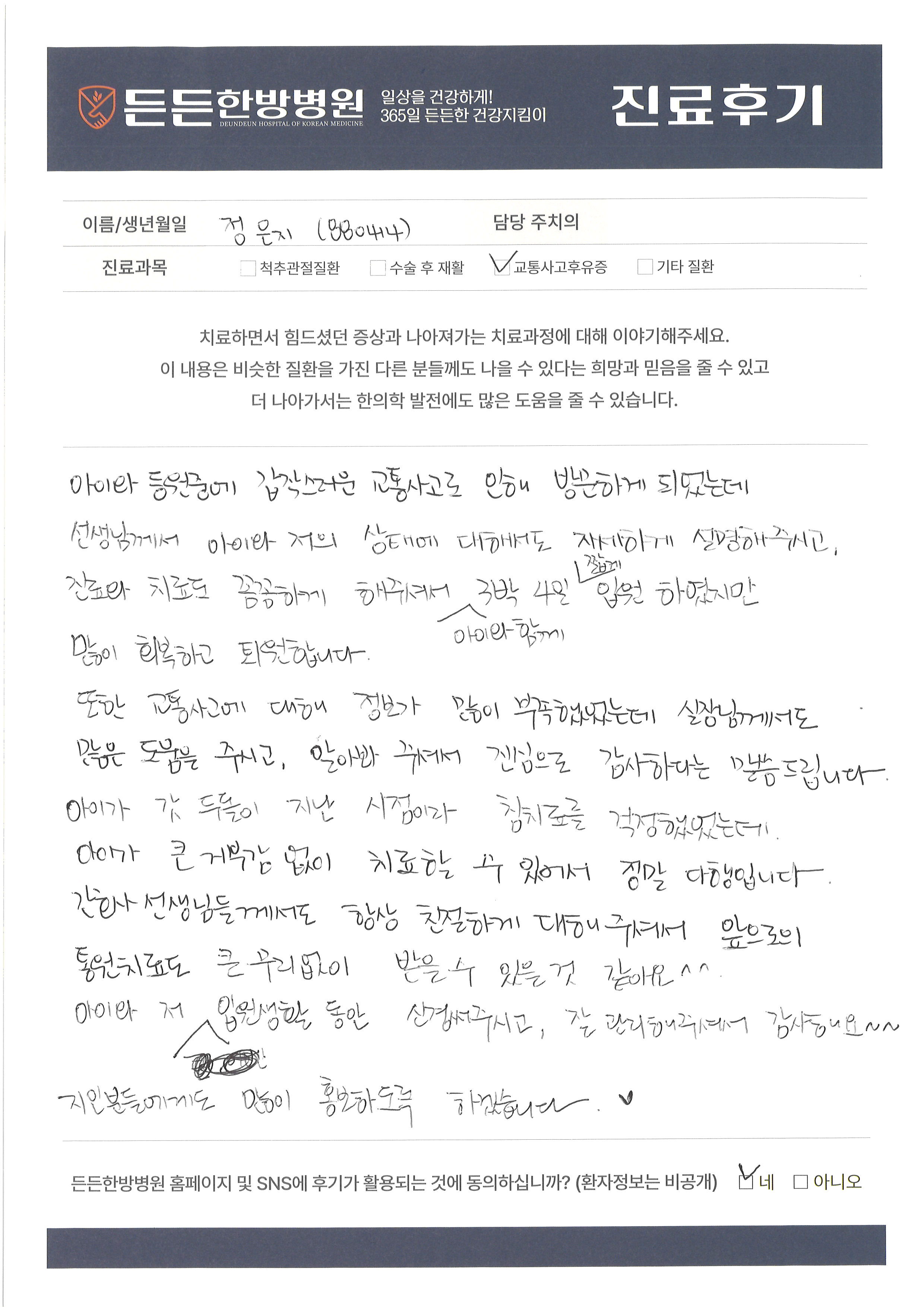 든든한방병원에서 치료받으신 환자분들의 후기를 확인하실 수 있습니다.