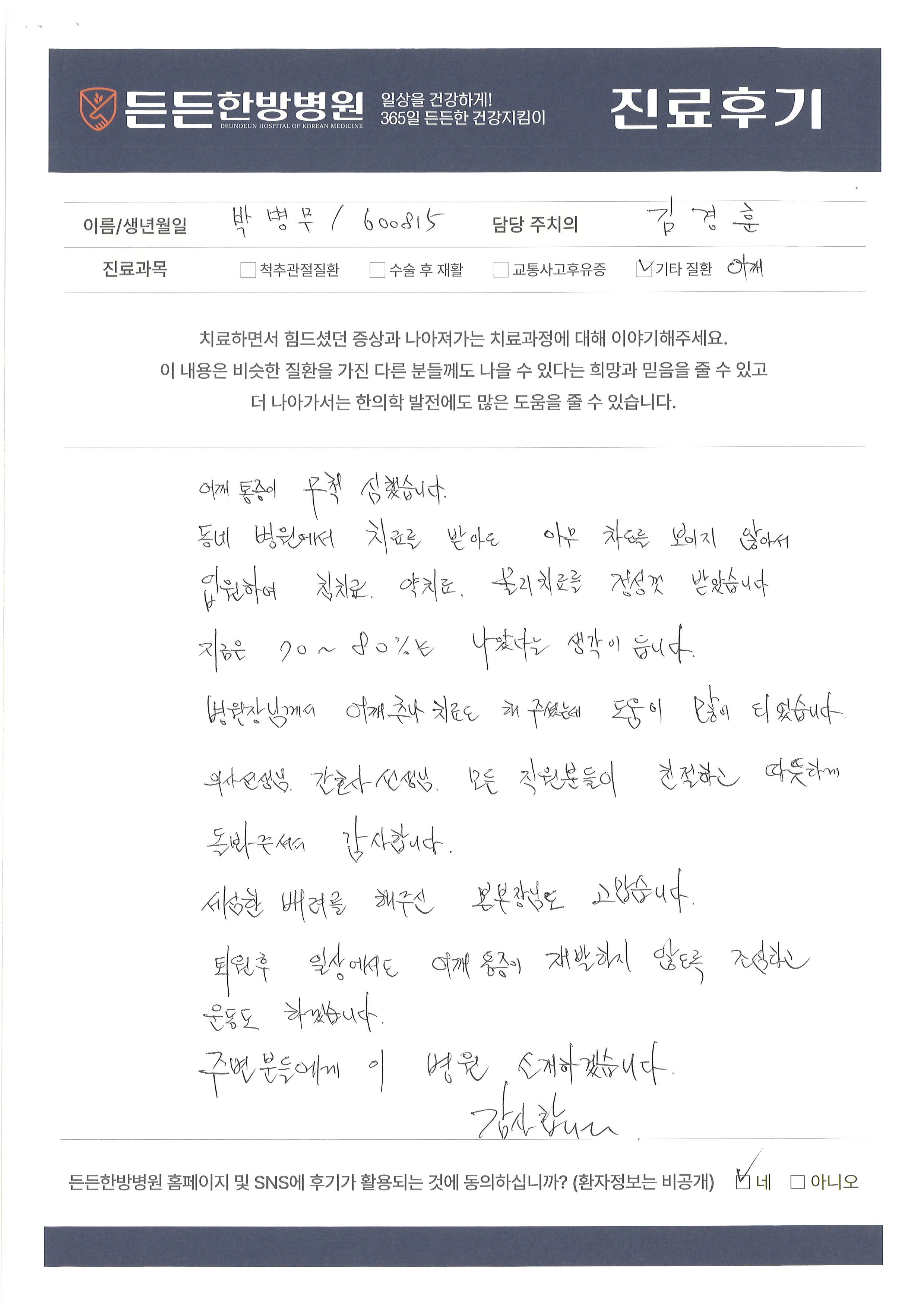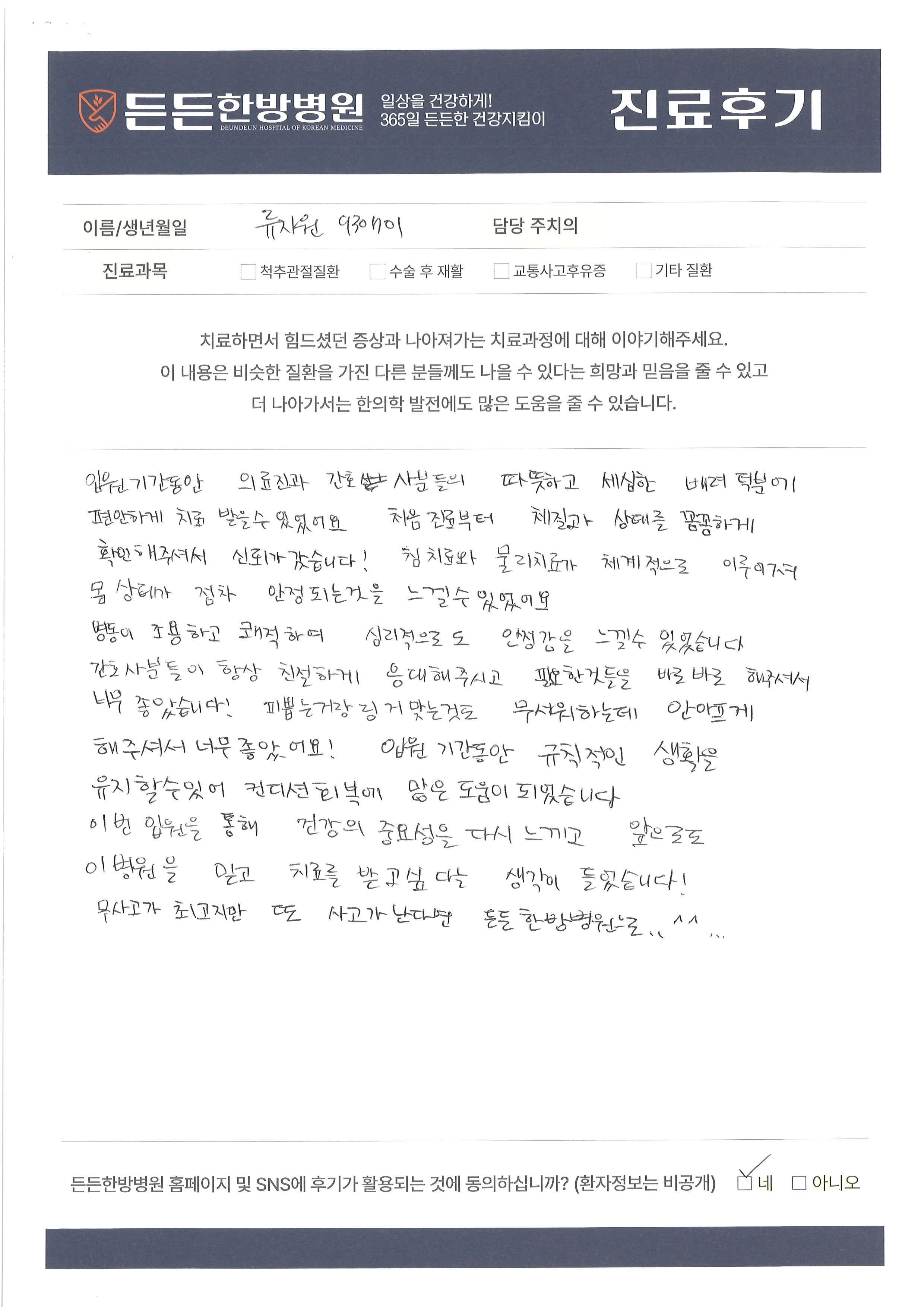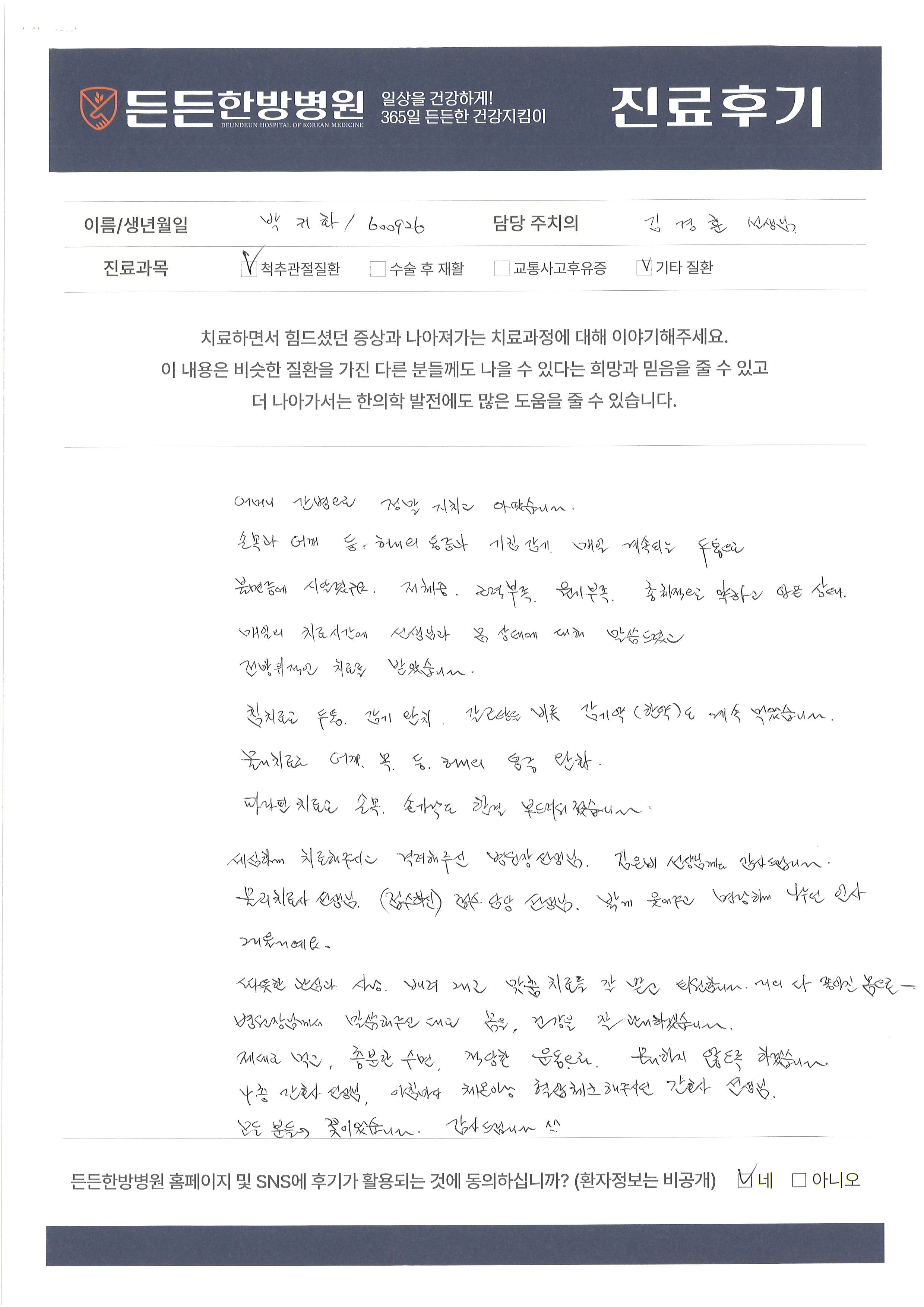 든든한방병원에서 치료받으신 환자분들의 후기를 확인하실 수 있습니다.