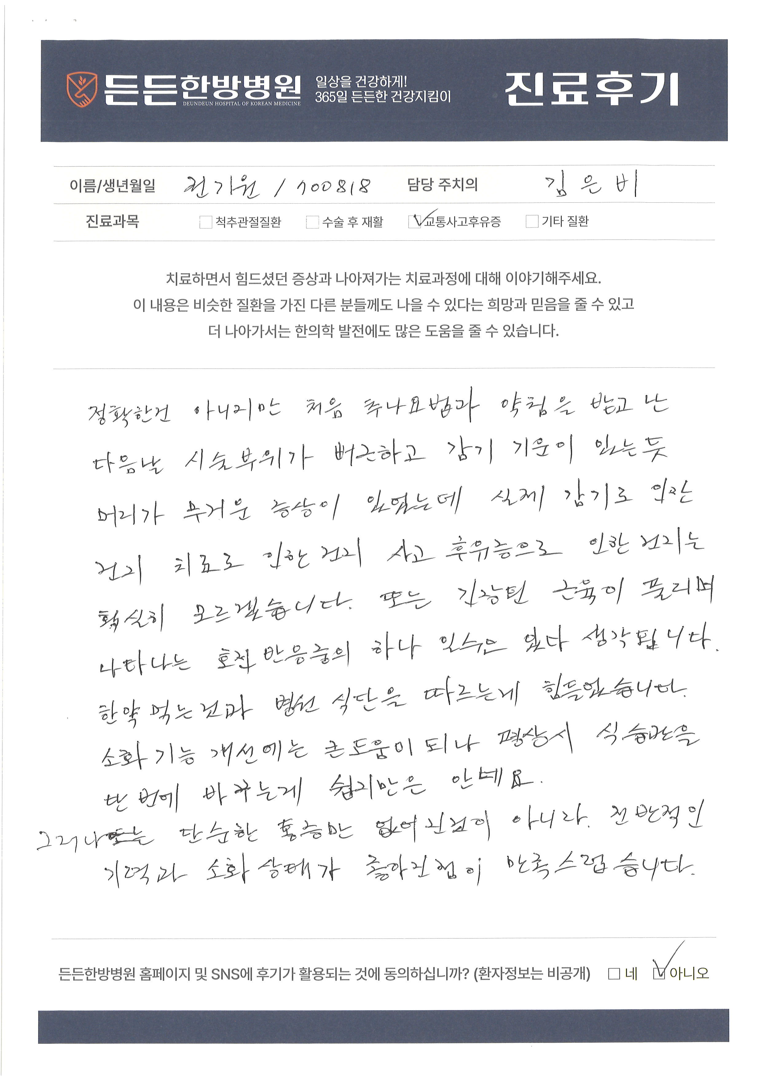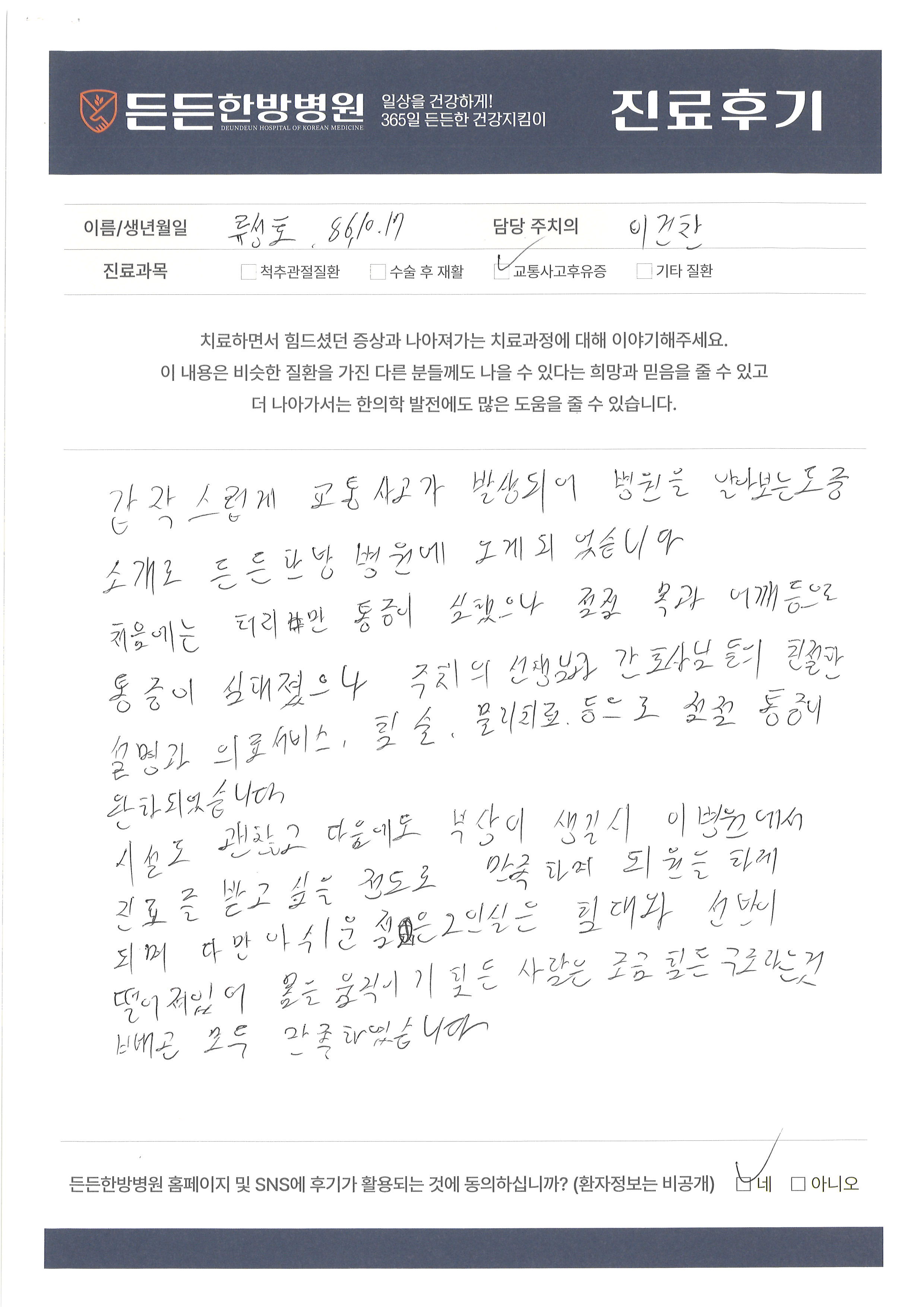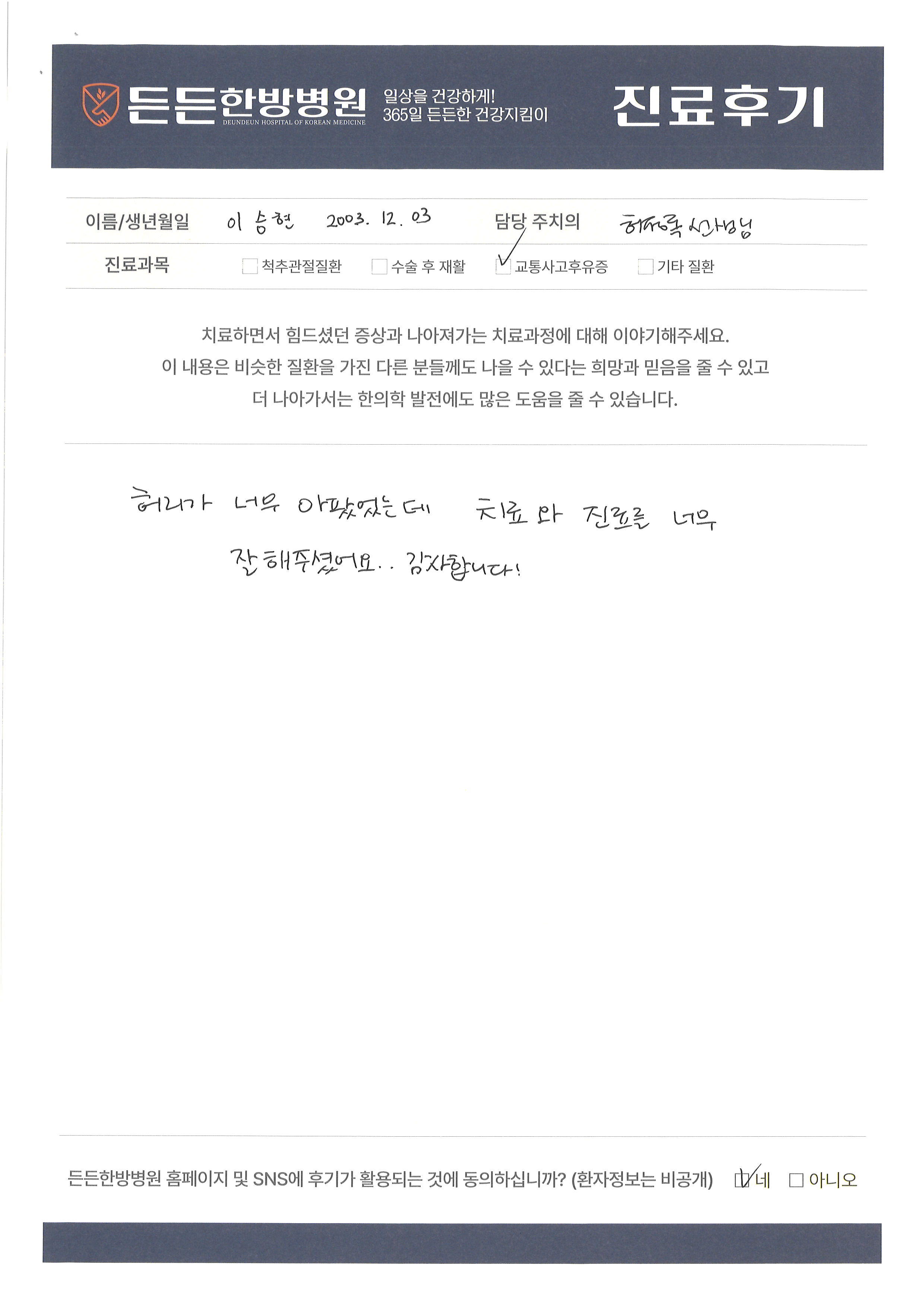 든든한방병원에서 치료받으신 환자분들의 후기를 확인하실 수 있습니다.