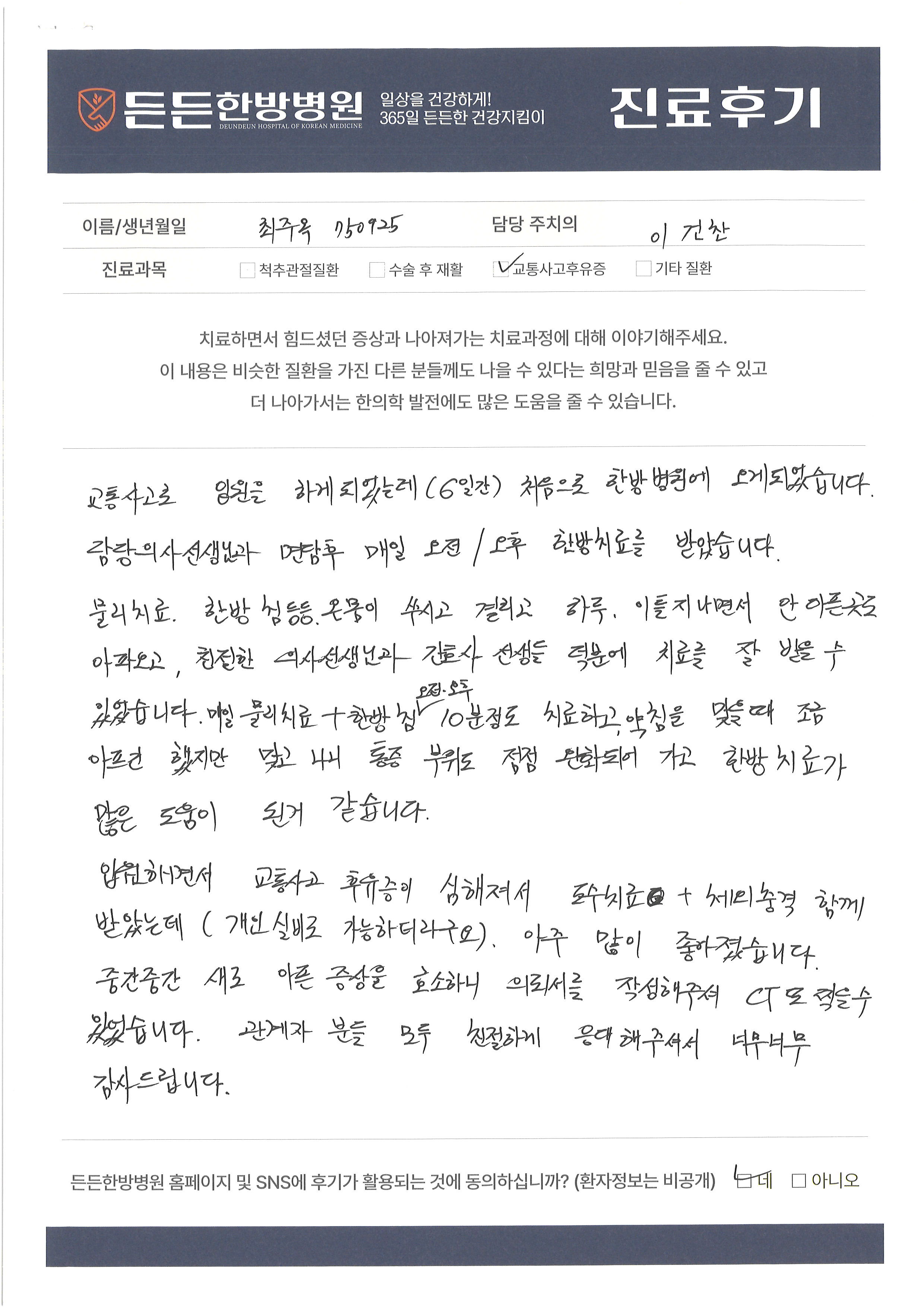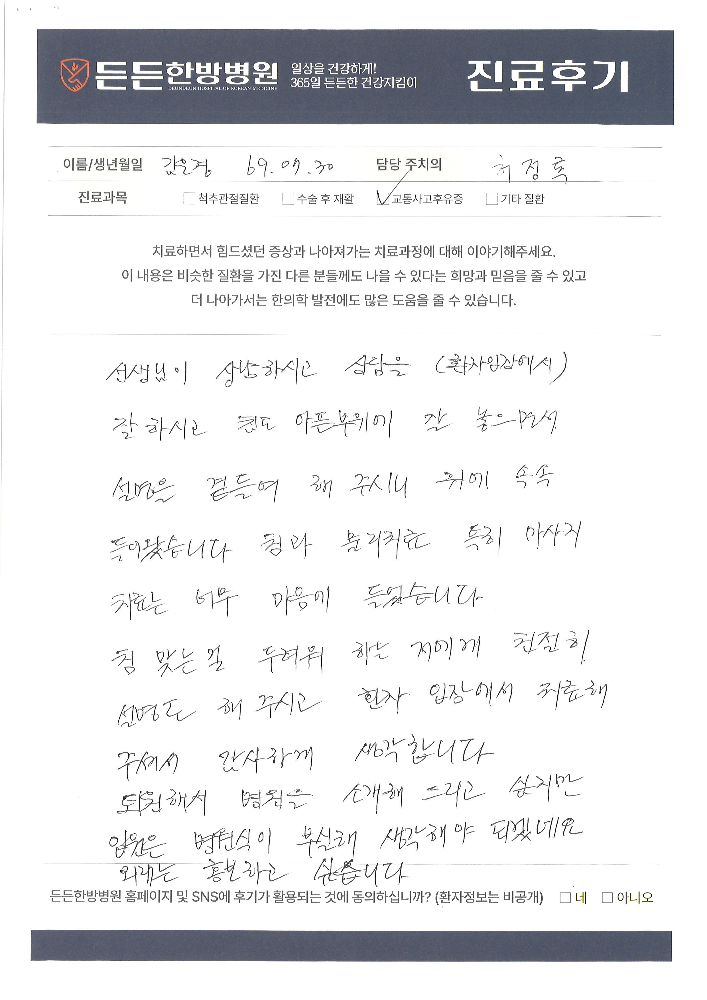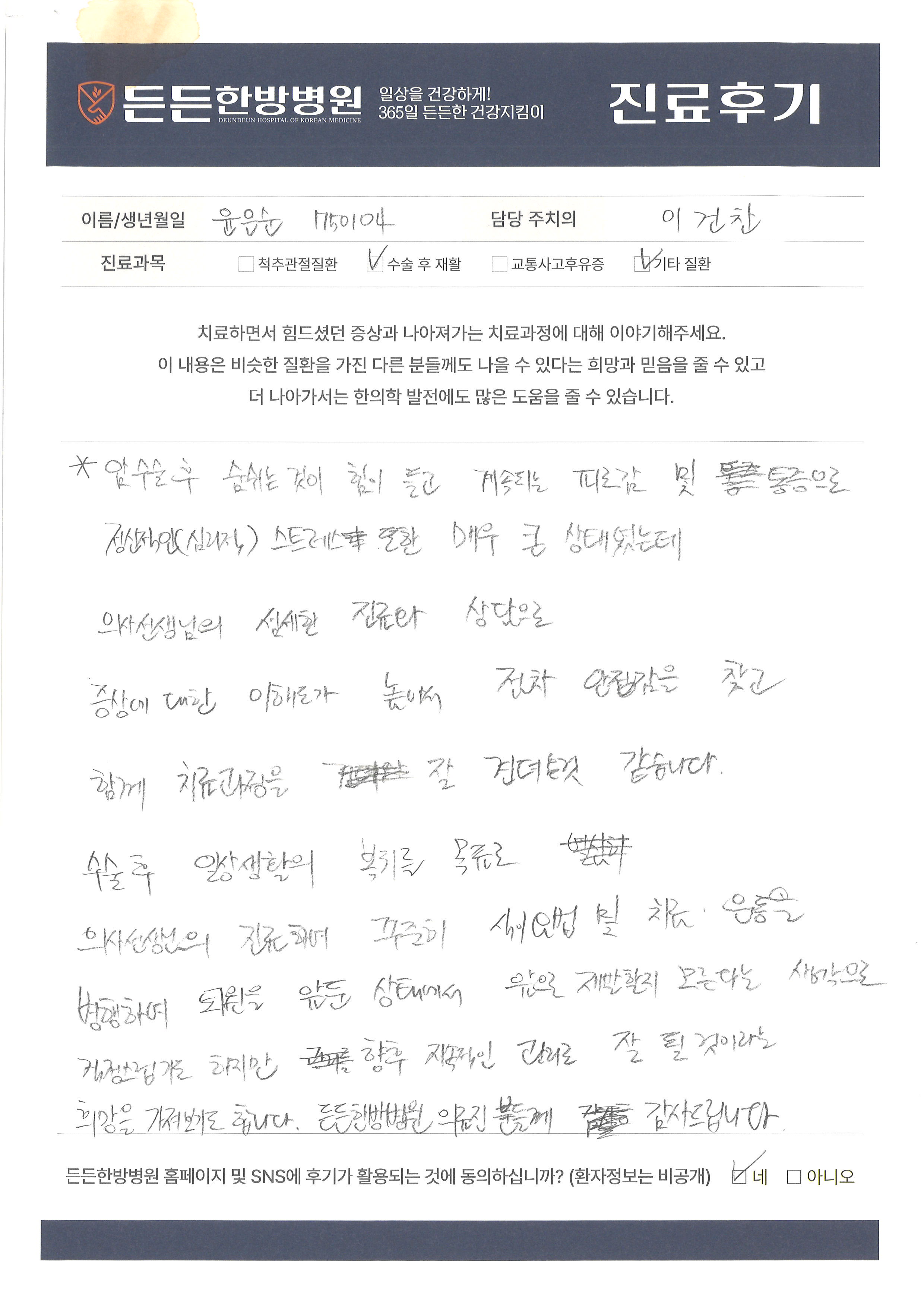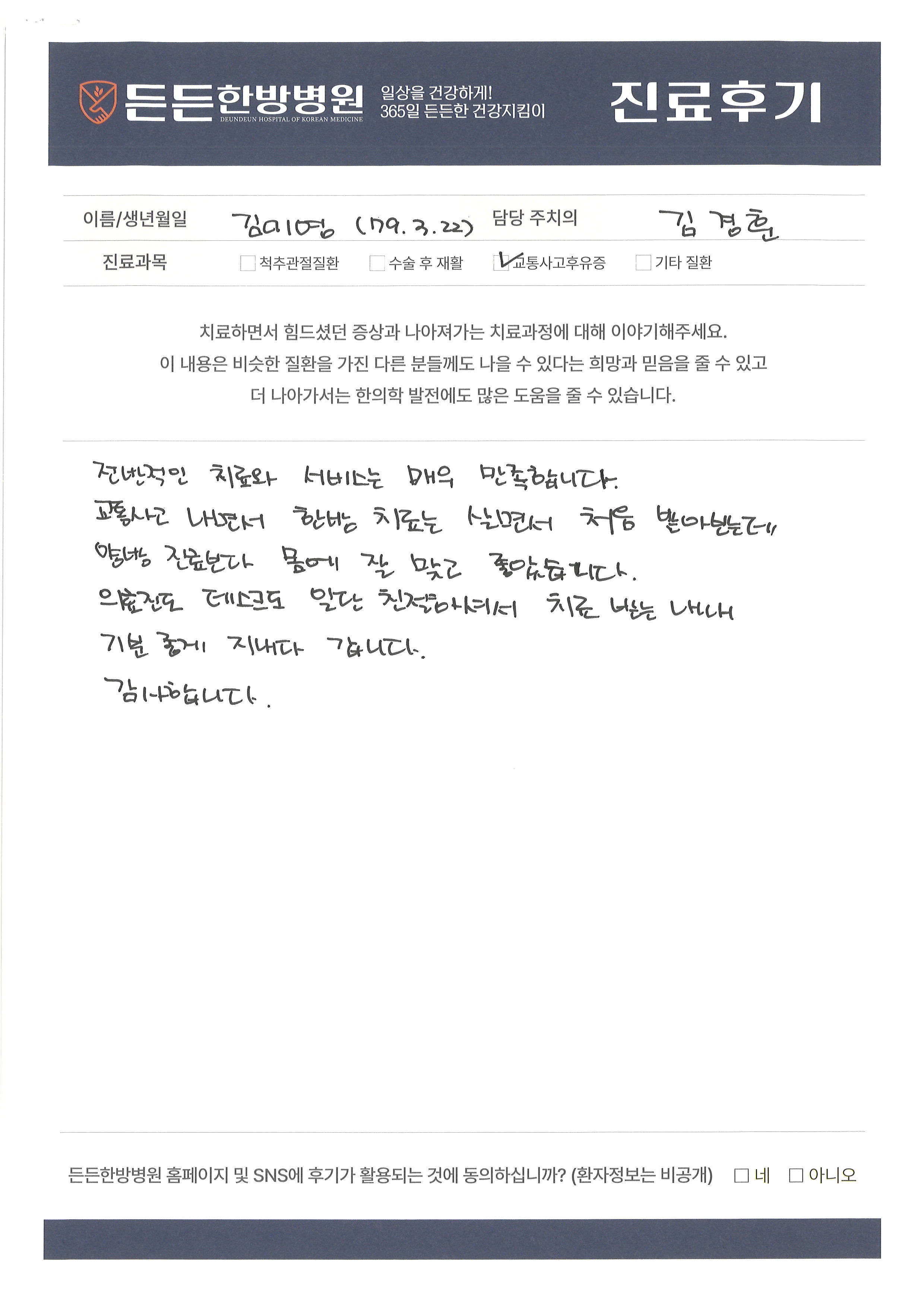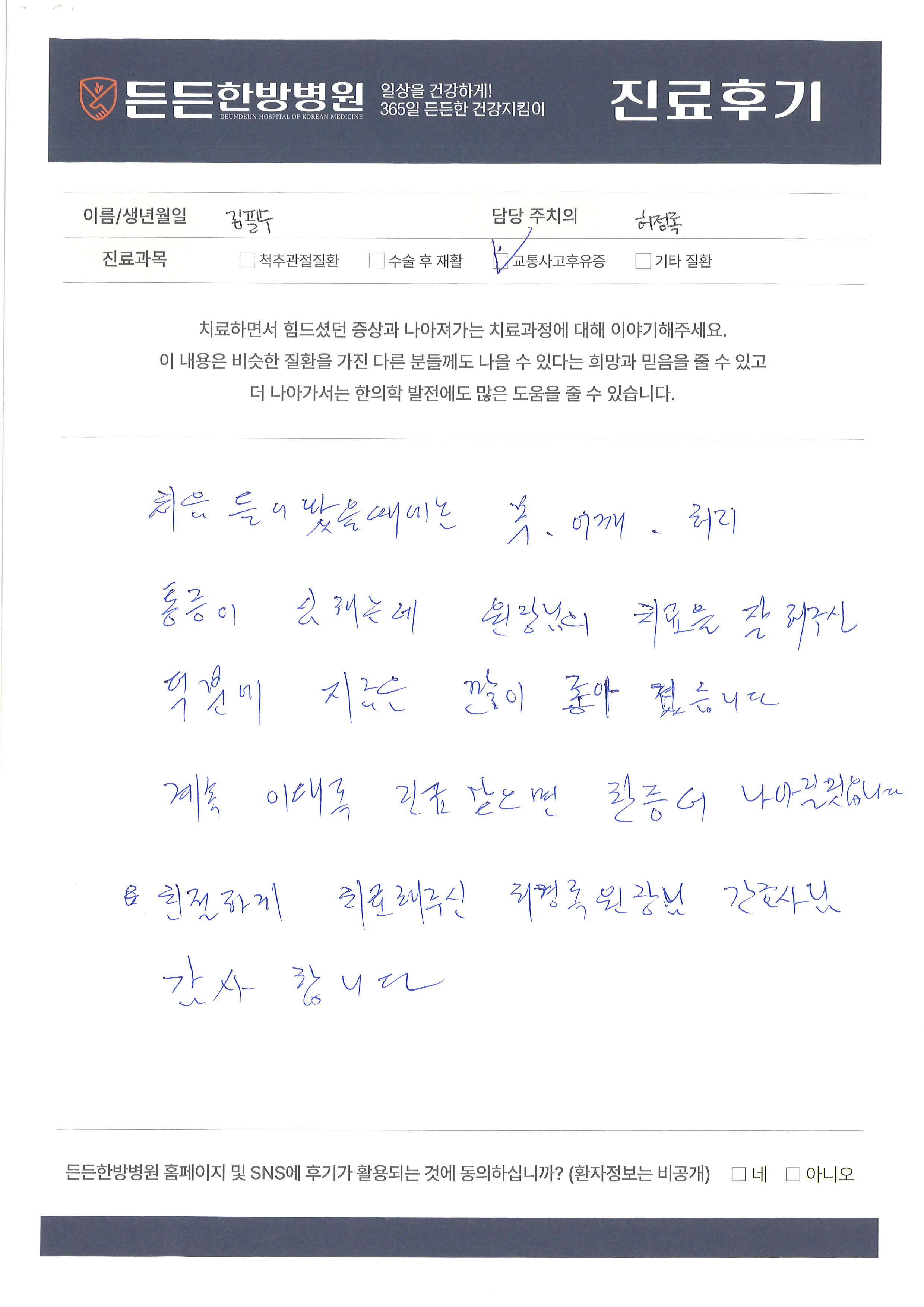 든든한방병원에서 치료받으신 환자분들의 후기를 확인하실 수 있습니다.